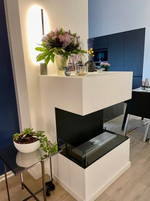 Trojsměrný krb jako rozdělovač místnosti, který lze zabudovat do zdi a umožňuje vám vidět plameny ze tří různých stran. Vyberte si z různých standardních rozměrů.